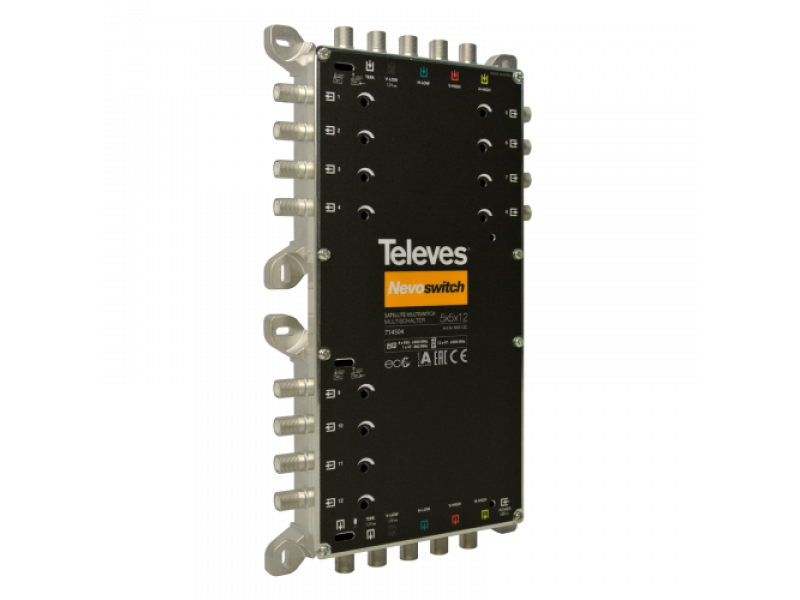 Multiswitch da 5 ingressi (uno terrestre e gli altri quattro per le polarità satellite ) e 12 uscite utente, in cascata, con un potenziometro da 12dB per le uscite utente.