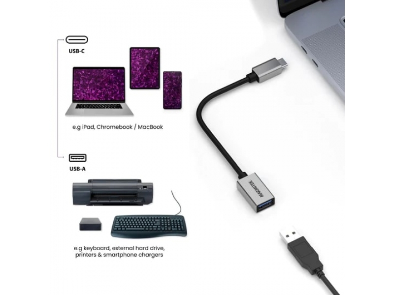 Questo adattatore USB-C converte una porta USB-C in una porta USB-A. Collega un disco rigido esterno a un computer portatile o collega una tastiera a un tablet o iPad. Oppure usa i cavi USB-A esistenti per caricare uno smartphone in una macchina con solo una connessione USB-C. Cavo in gomma flessibile di 15 cm per uso intensivo. Alloggiamento in alluminio solido; impedisce qualsiasi interferenza esterna.