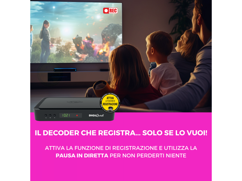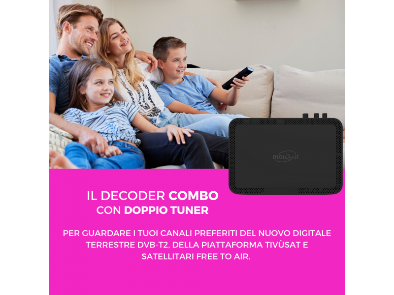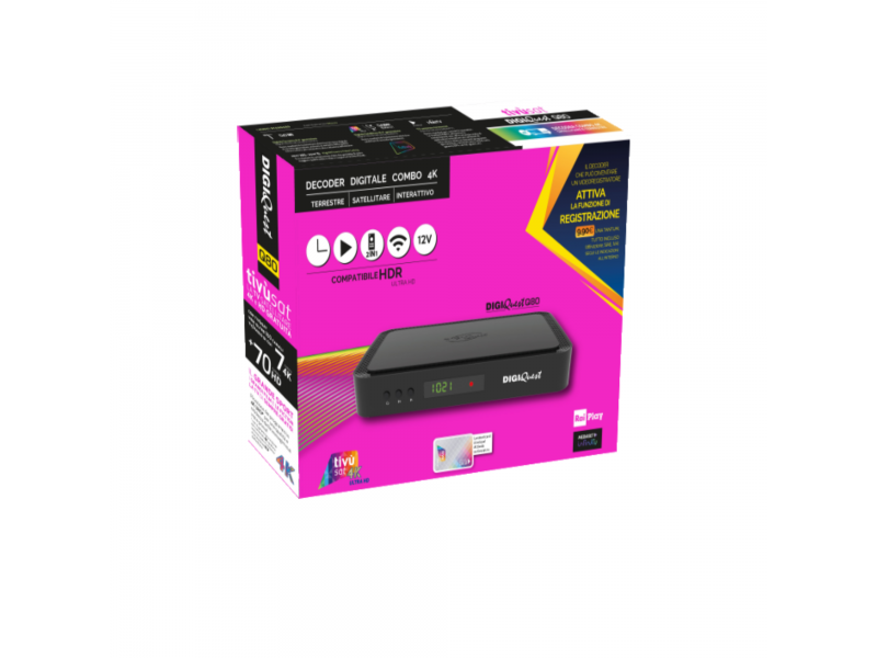 Digiquest Q80 è il decoder per tutti: permette la visione dei canali presenti sulla piattaforma tivù sat in 4K Ultra HD e HD , di tutti i canali satellitari Free To Air e di quelli del nuovo digitale terrestre DVB-T2 . Può diventare un videoregistratore , grazie alla funzione di registrazione attivabile : registra i tuoi programmi preferiti e sfrutta la funzione pausa in diretta ( Timeshift ). Grazie alla funzione HbbTv potrai accedere ad esempio a Rai Play e Mediaset Infinity, sfruttandone tutte le potenzialità! Mediaplayer e telecomando 2in1 che permette di poter controllare anche le principali funzioni della TV. Smartcard tivù era inclusa nella confezione.