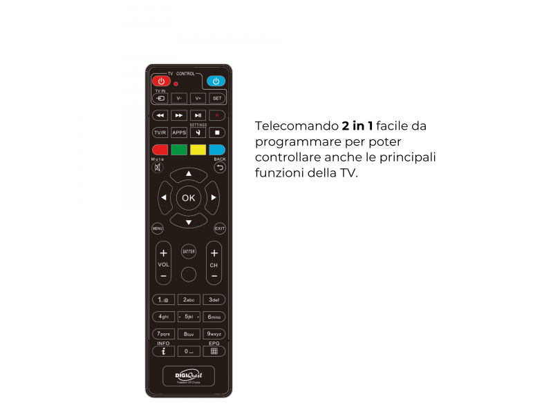 - Telecomando 2in1 e HbbTV: controlla sia il decoder che la TV con un unico telecomando e accedi facilmente ai contenuti on demand di RaiPlay e Mediaset Infinity grazie alla funzione HbbTV.