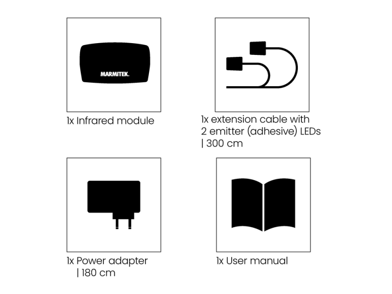 Emettitore a LED IR (adesivi): 300 cm (da connettore alla divisione 200 cm, dalla divisione al LED 100 cm) con connettore jack 3.5 mm
