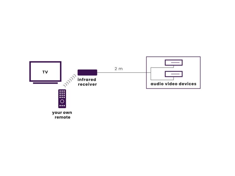 Metti in vista il ricevitore (piccola scatola nera) del tuo telecomando, che è stato collegato al trasmettitore/ai trasmettitori che hai attaccati ai dispositivi audiovisivi. Il segnale dal telecomando viene trasmesso dal ricevitore al/ai trasmettitore/trasmettitori. Il trasmettitore ’comanda’ quindi i dispositivi audiovisivi. Ciò garantisce che non sia necessario aprire gli sportelli dell'armadio per utilizzare i tuoi dispositivi.