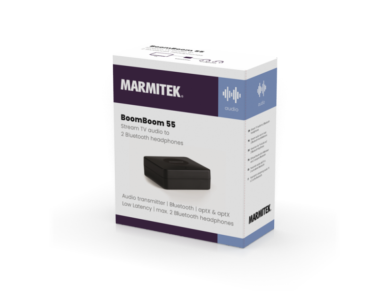 Il BoomBoom 55 è un trasmettitore audio Bluetooth, che consente di trasmettere in modalità wireless il suono di un televisore a cuffie Bluetooth. Il BoomBoom 55 Marmitek ha ingressi audio digitali e la tecnologia aptX Low Latency. Ciò garantisce un'eccellente esperienza audio. La tecnologia aptX Low Latency consente di eliminare quel fastidioso ritardo temporale tra immagini TV e audio delle cuffie. Un'altra caratteristica piacevole di questo modello è la possibilità di poter trasmettere l'audio contemporaneamente a due cuffie Bluetooth senza fili.