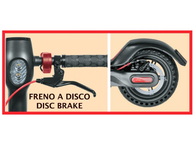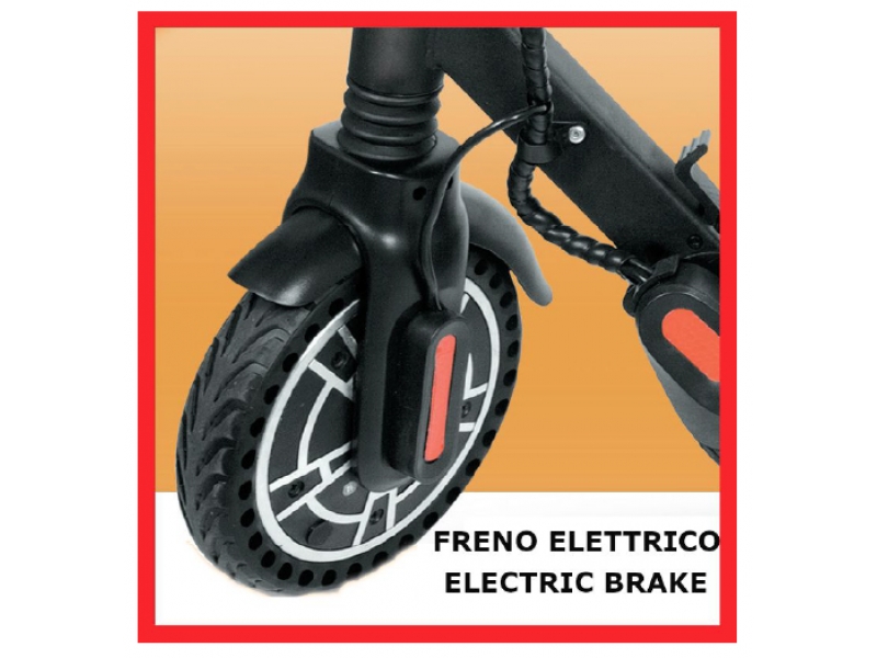 elettrico che agisce sulla ruota anteriore e freno a disco che agisce sulla ruota posteriore.