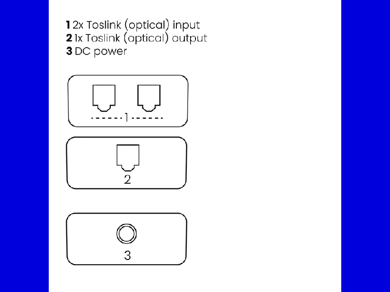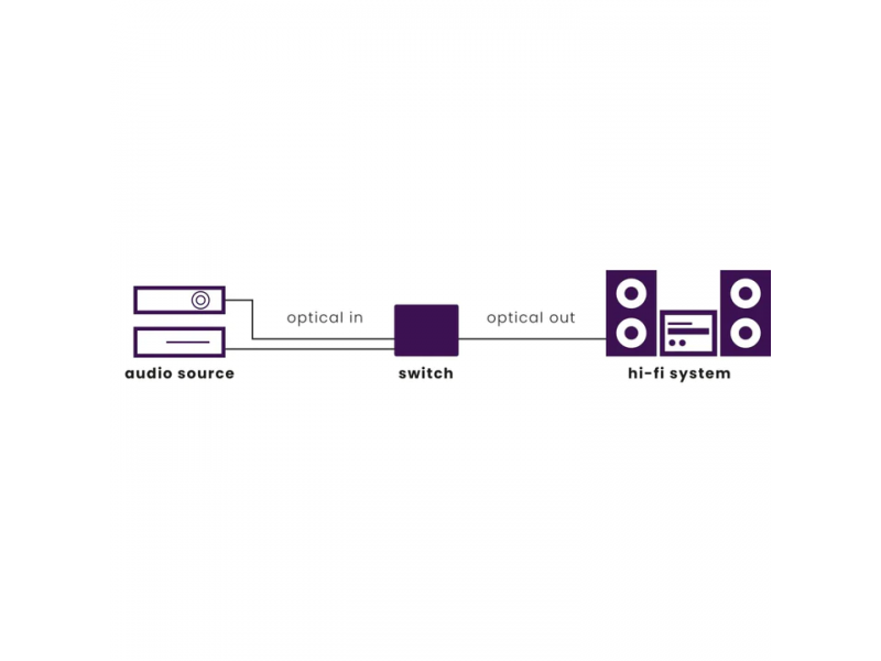 Se il tuo amplificatore dispone di un solo ingresso Toslink, grazie a questo commutatore è possibile collegare 2 dispositivi audio, che saranno collegati al ricevitore tramite 1 cavo Toslink. La commutazione avviene manualmente, tramite l'interruttore su questo commutatore.
