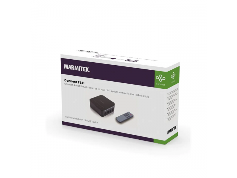 Utilizza questo switch audio se vuoi collegare più sorgenti audio a 1 ricevitore. Lo Switch TS41 commuta quattro ingressi ottici digitali (Toslink) su un'uscita senza ritardo o perdita di qualità. Con il telecomando fornito in dotazione si passa tra i vari dispositivi sorgente. Con una frequenza di campionamento migliorata di 192 kHz per la migliore riproduzione del suono.