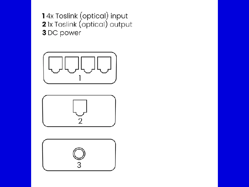 Se il tuo amplificatore dispone di un solo ingresso Toslink, grazie a questo commutatore è possibile collegare fino a 4 dispositivi audio, che saranno collegati al ricevitore tramite 1 cavo Toslink. Con il telecomando fornito in dotazione si passa tra i vari dispositivi sorgente.